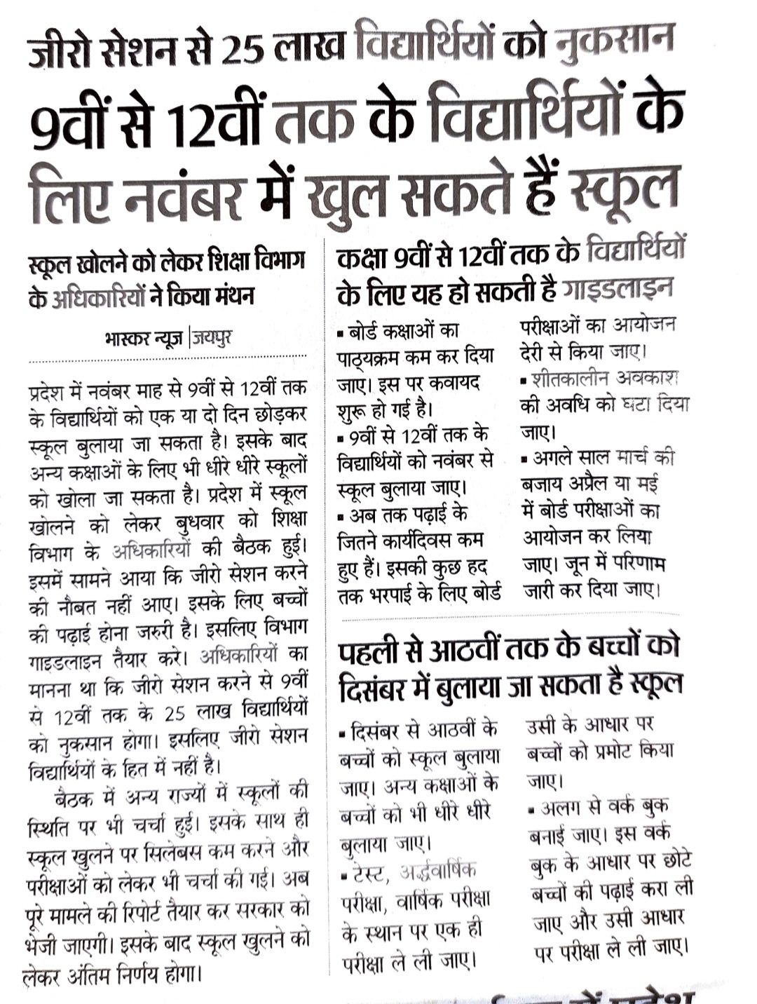 प्रदेश में नवंबर महीने से 9 वीं से 12वीं तक के विद्यार्थियों को एक या 2 दिन छोड़कर स्कूल बुलाया जा सकता है इसके बाद अन्य कक्षाओं के लिए धीरे-धीरे स्कूलों को खोला जा सकता है प्रदेश में स्कूल खोलने को लेकर बुधवार को शिक्षा विभाग के अधिकारियों की बैठक हुई इसमें सामने आया कि 0 सेशन करने की नौबत नहीं है इसके लिए बच्चों की पढ़ाई होना जरूरी है इसलिए विभाग गाइडलाइन तैयार करें अधिकारियों का मानना था कि जीरो सेवन करने से नबी से 12वीं तक की 2500000 विद्यार्थियों को नुकसान होगा इसलिए विद्यार्थियों की इसमें नहीं है।
