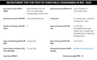 BSF Constable Tradesman Bharti 2020 Online Application Form : बीएसएफ में कॉन्स्टेबल ट्रेडमैन के 75 पदों के लिए नई भर्ती का नोटिफिकेशन जारी कर दिया गया है बीएसएफ कांस्टेबल के लिए योग्यता 10 वीं पास रखी गई है पात्र अभ्यर्थी इसके लिए ऑनलाइन आवेदन कर सकते हैं ऑनलाइन आवेदन शुरू हो चुके हैं जिसकी अंतिम तिथि 23 अक्टूबर 2020 है बीएसएफ ट्रेडमैन भर्ती 2020 का ऑफिशल नोटिफिकेशन नीचे दिया गया है इसके अलावा योग्यता आयु सीमा सिलेक्शन प्रोसेस की जानकारी भी नीचे दी गई है