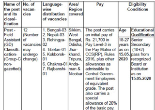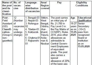 कैबिनेट सचिवालय फील्ड असिस्टेंट भर्ती 2020 के लिए योग्यता 12 वीं पास रखी गई है ।