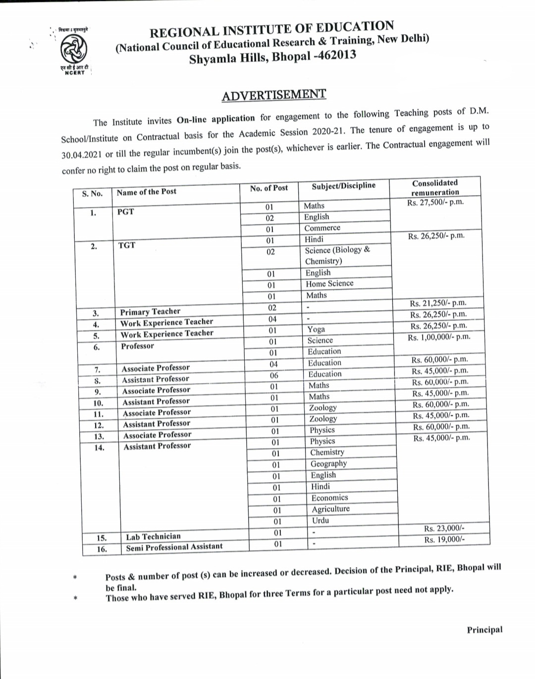 NCERt, Bhopal Recruitment 2020, PGT / TGT / PRIMARY TEACHER / WET(YOGA) Professor / Associate Profesor / Assistant Professor / Lab Technician / Semi Professional Assistant / WET 2020 VACANCY NOTIFICATION, QUALIFICATION, AGE LIMIT, SYLLABUS