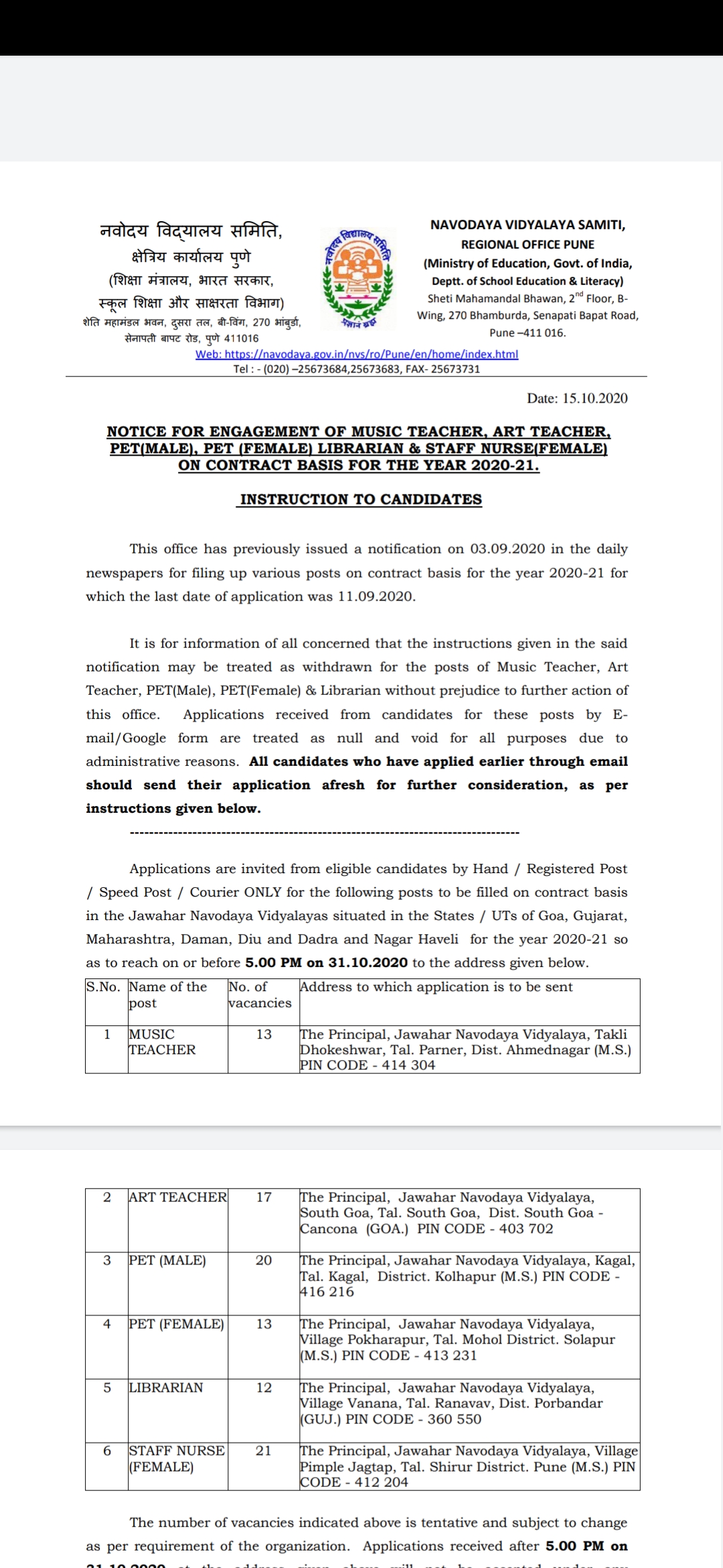 Art Teacher – The Principal , Jawahar Navodaya Vidyalaya , South Goa , Tal . South Goa , Dist . South Goa – Cancona ( GOA . ) PIN CODE – 403 702 . PET ( MALE ) – 20 The Principal , Jawahar Navodaya Vidyalaya , Kagal , Tal . Kagal , District . Kolhapur ( M.S. ) PIN CODE – 416 216 .