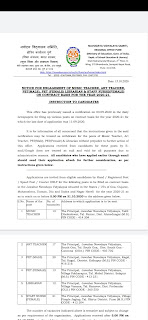 Music Teacher : Four years recognized Diploma in any Discipline of Fine Arts As Drawing / Painting / Sculpture / Graphic Arts / Crafts after passing Secondary Examination ( class X or equivalent ) ( OR ) Five years Recognized Diploma in any discipline of Fine Arts as Drawing / Painting / Sculpture / Graphic Arts / Crafts after passing Secondary Examination ( Class X or equivalent ) ( OR ) Degree in Fine Arts / Crafts ( OR ) B.Ed. Degree in Fine Arts from Regional College of Education .