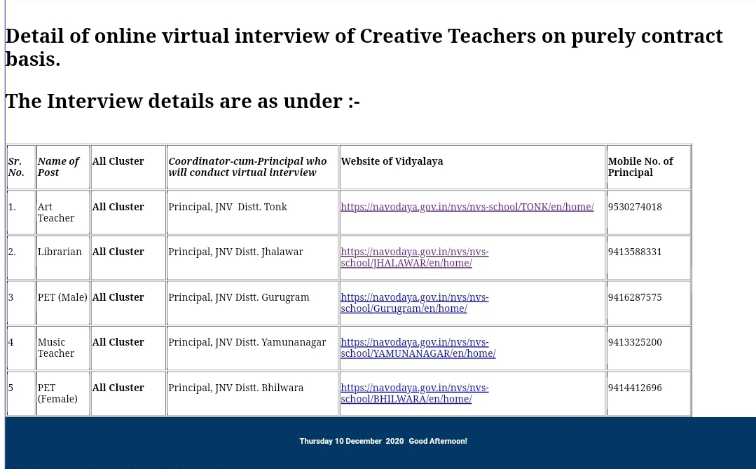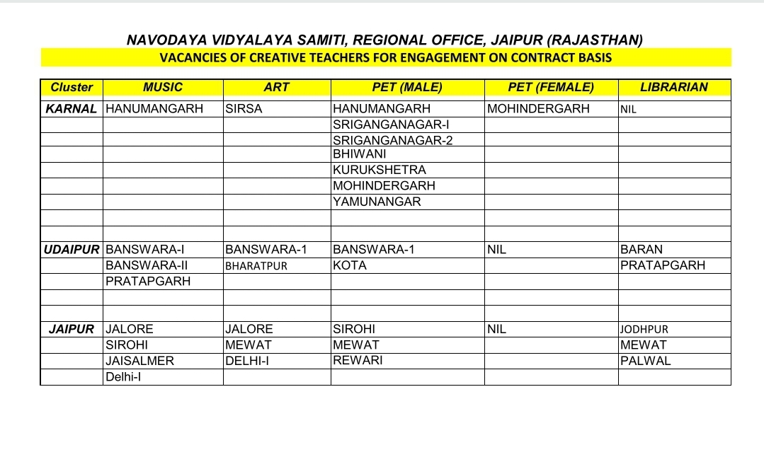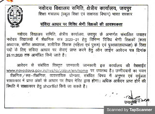 (NVS) नवोदय विद्यालय समिति जयपुर ने नई संविदा भर्ती का नोटिफिकेशन जारी कर दिया है जिसमें म्यूजिक टीचर Art टीचर PET मेल और फीमेल , लाइब्रेरियन पर नोटिफिकेशन जारी किया है अध्यापक , लाइब्रेरियन , के लिए ऑनलाइन शुरू हो चुके हैं आवेदन की अंतिम तिथि 25 नवम्बर 2020 है ,नवोदय विद्यालय भर्ती 2020 का ऑफिशल नोटिफिकेशन नीचे दिया गया है