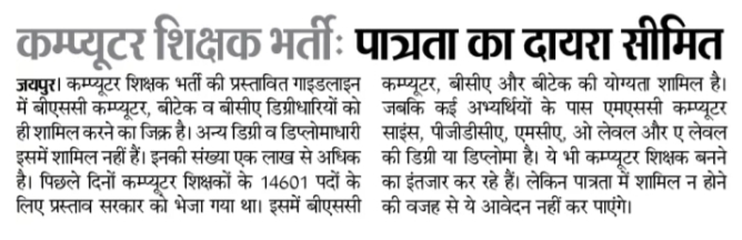 Rajasthan Computer Teacher Vacancy 2021 की प्रस्तावित गाइडलाइन में बीएससी कम्प्यूटर , बीटेक व बीसीए डिग्रीधारियों को ही शामिल करने का जिक्र है । अन्य डिग्री व डिप्लोमाधारी इसमें शामिल नहीं हैं । इनकी संख्या एक लाख से अधिक है । पिछले दिनों Rajasthan Computer Teacher Vacancy 2021 के 14601 पदों के लिए प्रस्ताव सरकार को भेजा गया था । इसमें बीएससी कम्प्यूटर , बीसीए और बीटेक की योग्यता शामिल है । जबकि कई अभ्यर्थियों के पास एमएससी कम्प्यूटर साइंस , पीजीडीसीए , एमसीए , ओ लेवल और ए लेवल की डिग्री या डिप्लोमा है । ये भी कम्प्यूटर शिक्षक बनने का इंतजार कर रहे हैं । लेकिन पात्रता में शामिल न होने की वजह से ये आवेदन नहीं कर पाएंगे ।