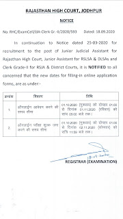 Rajasthan highcourt LDC Clerk Recruitment 2020 Rajasthan High Court Jodhpur has issued a notification for direct recruitment to the vacant posts of Junior Judicial Assistant Clerk Grade Second Junior Assistant Under this, 18 clerical grade seconds of 8 Junior Assistant of total 268 clerical grade seconds of Junior Judicial Assistant.  1100 Junior Assistant 350 Martyrs will be recruited for a total of 1760 posts Interested and eligible candidates can apply online through the official websiteHai court.nic.in Online application period] October 2020 Last date from 7:00 pm to 1 November 2020  Candidates will be able to fill up by 5:30 pm. Before applying online, the candidates should check the official notification properly, the notification of this recruitment was already released but was postponed due to Corona virus. Now its application started again  Has only changed the date of online application, the rest of the notification will remain the same.