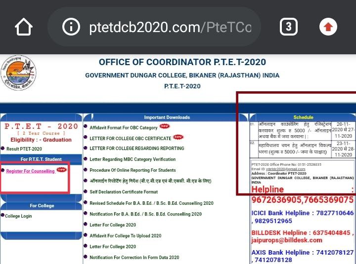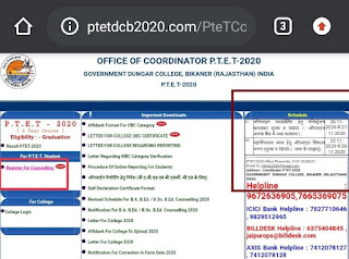 *Rajasthan PTET Counseling 2020 : Rajasthan PTET Counseling 2020 के फॉर्म शुरू हो गए हैं PTET का रिजल्ट 4 अक्टूबर को जारी कर दिया गया है अब सभी अभ्यर्थियों को PTET Counseling में भाग लेना है जिसके लिए Deposit collage Fess 02/12/2020 to 05/12 /2020 सबसे पहले 20 नवंबर से 27 नवंबर 2020 तक काउंसलिंग हेतु ₹ 5000 की फीस जमा करानी होगी उसके बाद में महाविद्यालय चयन हेतु ऑनलाइन विकल्प पत्र भरना होगा जो कि 23 नवंबर से 28 नवंबर 2020 तक भरा जाएगा ऑनलाइन आवेदन करते समय Counseling किसी अपने पसंदीदा कॉलेज अन्य जानकारियां भरनी है यहां पर हम आपको Rajasthan PTET Counseling 2020 शेड्यूल फॉर्म कब से कब तक होंगे , कोई भी अभ्यर्थी PTET की Counseling में भाग लिए बिना B.Ed नहीं कर सकता है PTET Counseling में भाग लेने के लिए अभ्यर्थी के पास में संपूर्ण ओरिजिनल दस्तावेज होने जरूरी नहीं जो किससे काउंसलिंग के समय आवश्यक है ।
