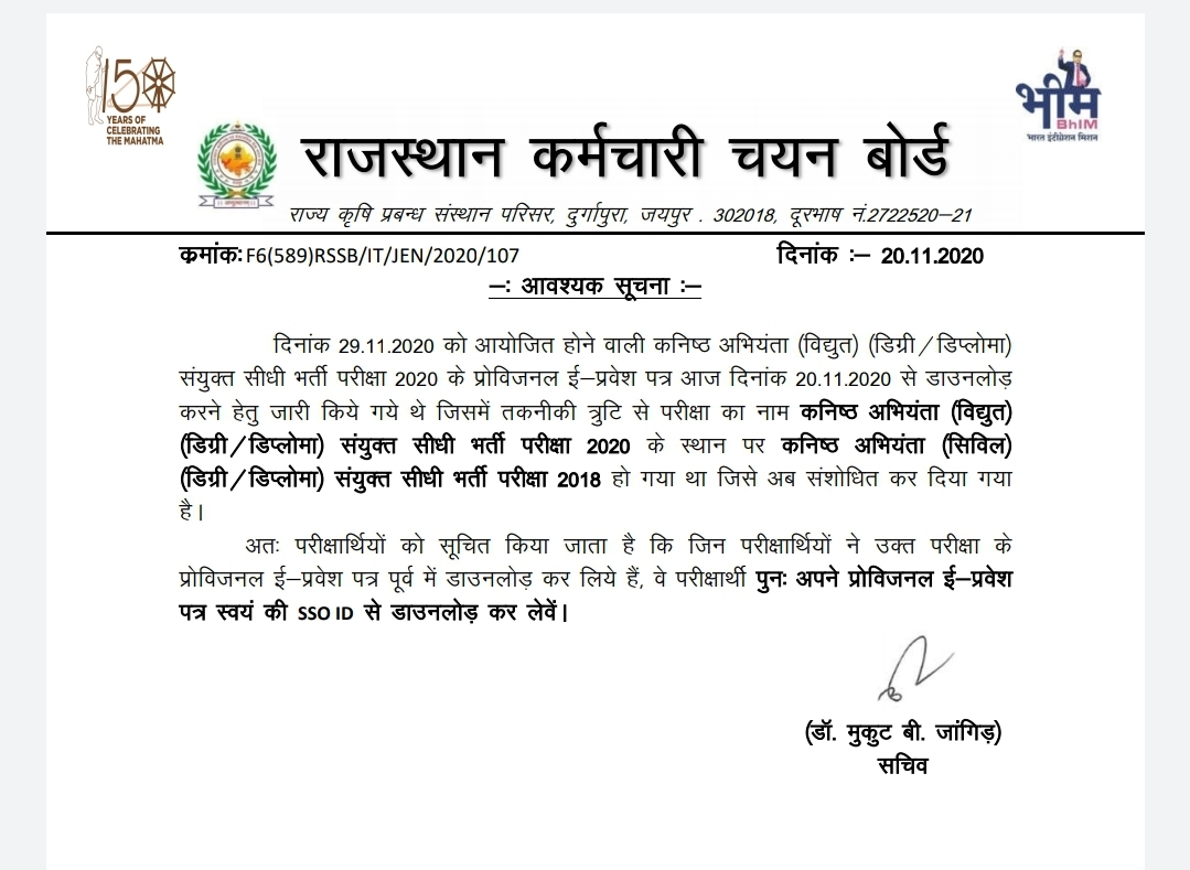 राजस्थान कनिष्ठ अभियंता सीधी भर्ती 2020 के एडमिट कार्ड दो पारियों में जारी किए जाएंगे RSMSSB JEN Admit Card 2020 जारी कर दिए गए हैं