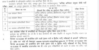 शैक्षणिक योग्यता रखते हैं दिनांक 13.12.2020 को आयोजित होने वाली ( प्रथम पारी व द्वितीय पारी ) परीक्षाओं के अभ्यर्थी ” प्रोविजनल ई – प्रवेश पत्र बोर्ड की वेबसाइट www.rsmssb.rajasthan.gov.in से दिनांक : 07.12.2020 तथा दिनांक 26.12.2020 को आयोजित होने वाली ( प्रथम पारी व द्वितीय पारी ) परीक्षाओं के लिए दिनांक 18.12.2020 से यथाशीघ्र डाउनलोड कर लें । बोर्ड द्वारा परीक्षार्थियों को अलग से प्रवेश पत्र प्रेषित नही किये जायेगे ।