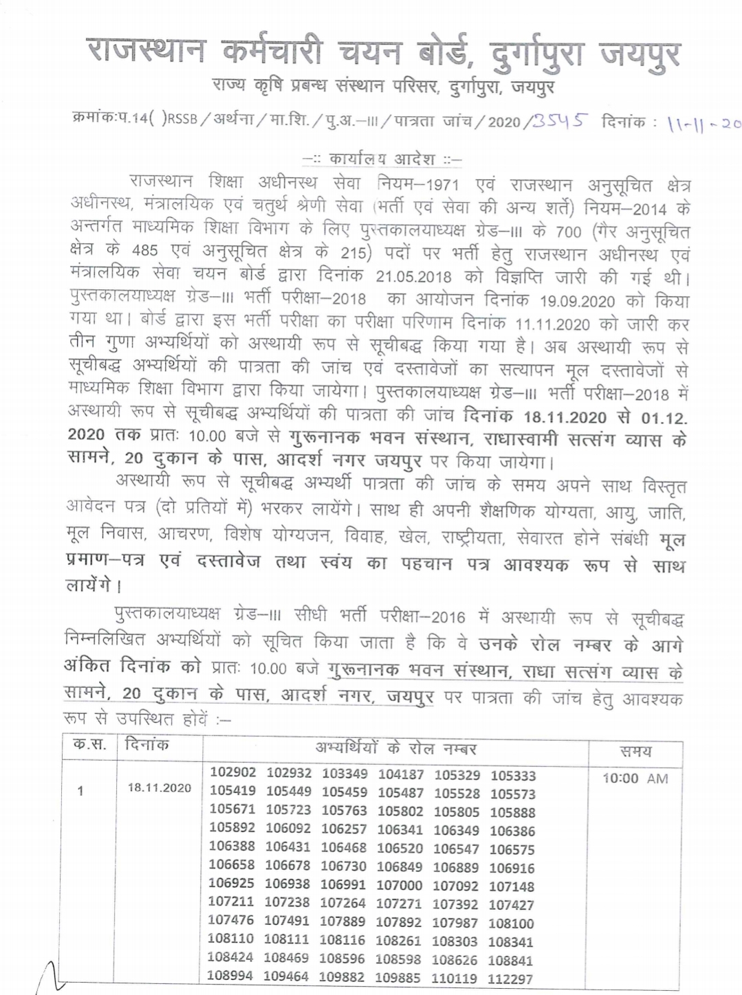 рдкреБрд╕реНрддрдХрд╛рд▓рдпрд╛рдзреНрдпрдХреНрд╖ рдЧреНрд░реЗрдб- III рднрд░реНрддреА рдЕрд╕реНрдерд╛рдпреА рд░реВрдк рд╕реЗ рд╕реВрдЪреАрдмрджреНрдз рдЕрднреНрдпрд░реНрдерд┐рдпреЛрдВ рдХреА рдкрд╛рддреНрд░рддрд╛ рдХреА рдЬрд╛рдВрдЪ рджрд┐рдирд╛рдВрдХ 18.11.2020 рд╕реЗ 01.12 . 2020 рддрдХ рдкреНрд░рд╛рддрдГ 10.00 рдмрдЬреЗ рд╕реЗ рдЧреБрд░реВрдирд╛рдирдХ рднрд╡рди рд╕рдВрд╕реНрдерд╛рди , рд░рд╛рдзрд╛рд╕реНрд╡рд╛рдореА рд╕рддреНрд╕рдВрдЧ рд╡реНрдпрд╛рд╕ рдХреЗ рд╕рд╛рдордиреЗ , 20 рджреБрдХрд╛рди рдХреЗ рдкрд╛рд╕ , рдЖрджрд░реНрд╢ рдирдЧрд░ рдЬрдпрдкреБрд░ рдкрд░ рдХрд┐рдпрд╛ рдЬрд╛рдпреЗрдЧрд╛ ред