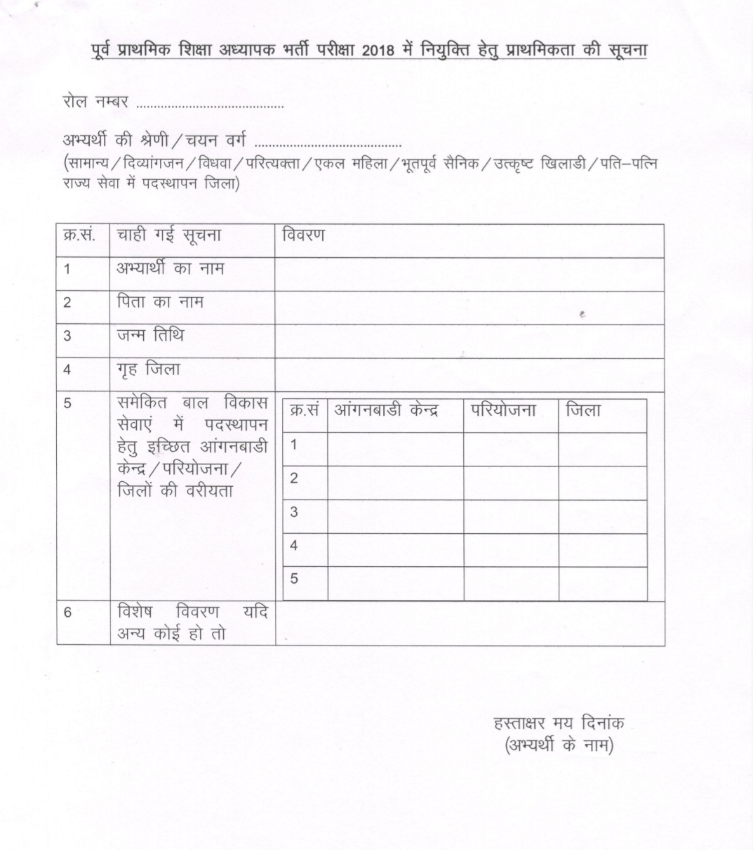 राजस्थान कर्मचारी चयन बोर्ड जयपुर द्वारा आयोजित पूर्व प्राथमिक शिक्षा अध्यापक भर्ती परीक्षा 2018 में अंतिम रूप से चयनित / आवंटित अभ्यर्थियों को नियुक्ति स्थान आवंटन के सम्बन्ध में । राजस्थान कर्मचारी चयन बोर्ड जयपुर दिनांक 10-11-2020 द्वारा आयोजित पूर्व प्राथमिक शिक्षा अध्यापक भर्ती परीक्षा 2018 में चयनित अभ्यर्थियों में से 490 ( NON – TSP ) 10 ( TSP ) अभ्यर्थियों को उक्त पद पर समेकित बाल विकास सेवाएं राज . , में नियुक्ति दी जानी अतः अंतिम रूप से चयनित अभ्यर्थी संलग्न प्रपत्र में नियुक्ति हेतु आंगनबाड़ी केन्द्र की प्राथमिकता भरकर मेल आईडी ishwarprasadyadav143@gmail.com पर दिनांक 30-11-2020 को सांय 5.00 बजे तक आवश्यक रूप से भिजवाया जाना सुनिश्चित करें ।
